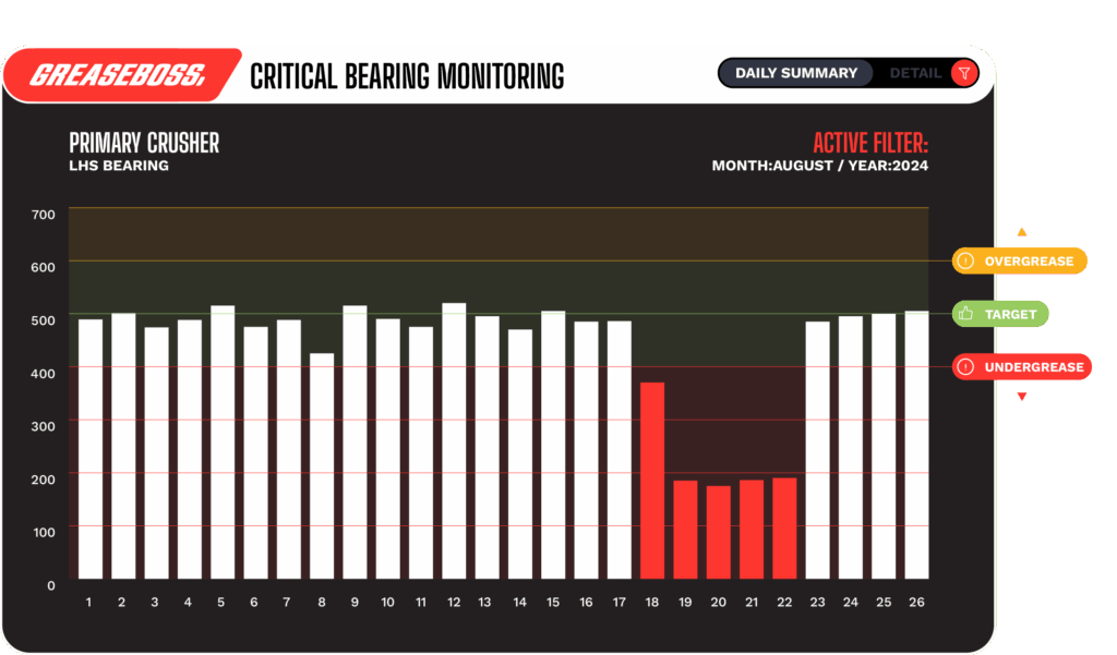 The Greaseboss Cloud compares the planned vs actual greasing and triggers automatic alerts to maintenance teams if there is an issue with the automatic lubrication system.